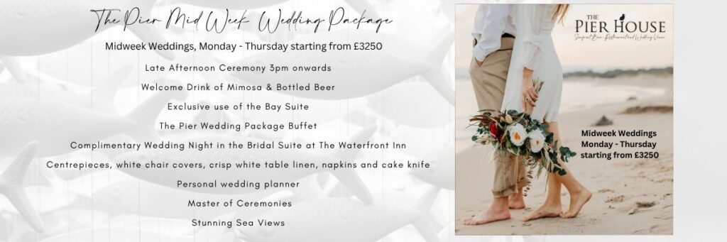 Our dreamy coastal wedding packages at The Pier House start at £3250 for a magical midweek celebration for 35 guests.
